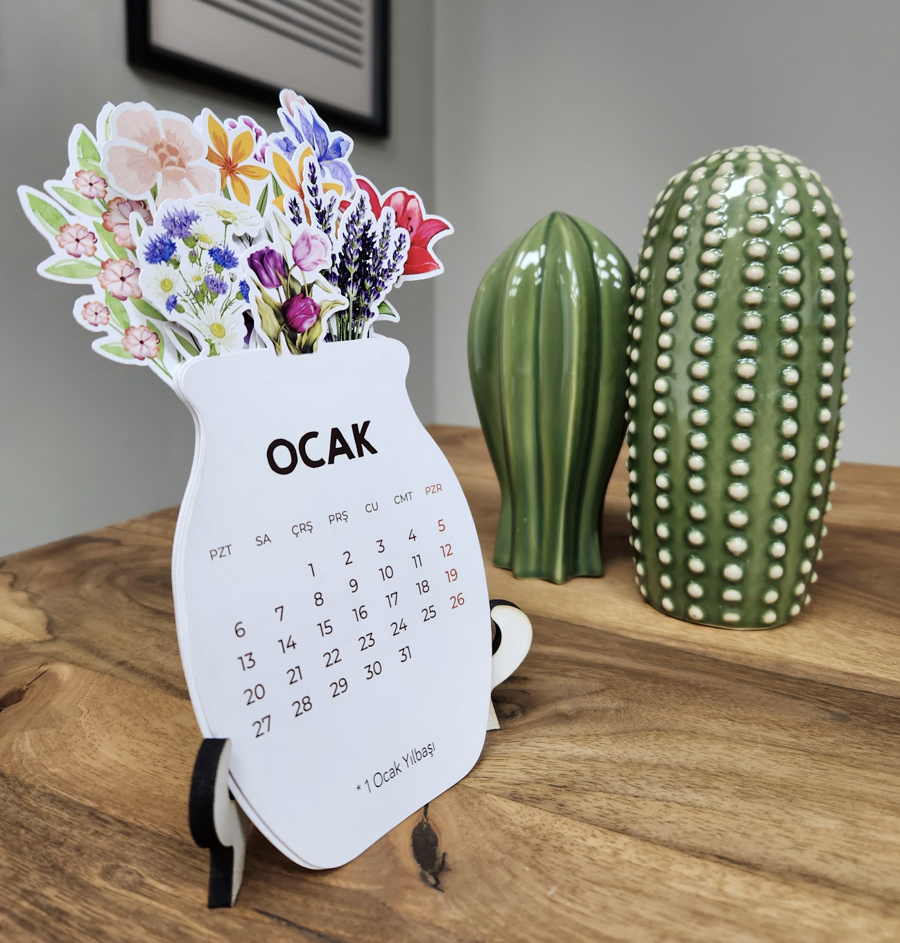 - Ahşap ayakları sayesinde sağlam ve dayanıklı bir kullanım sunan bu takvim, uzun süreli kullanım için idealdir.